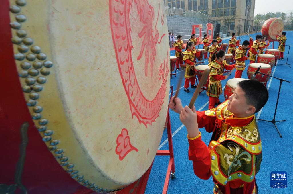 9月29日,在山东青岛启润实验学校举行的迎国庆主题活动中,学生表演鼓舞。