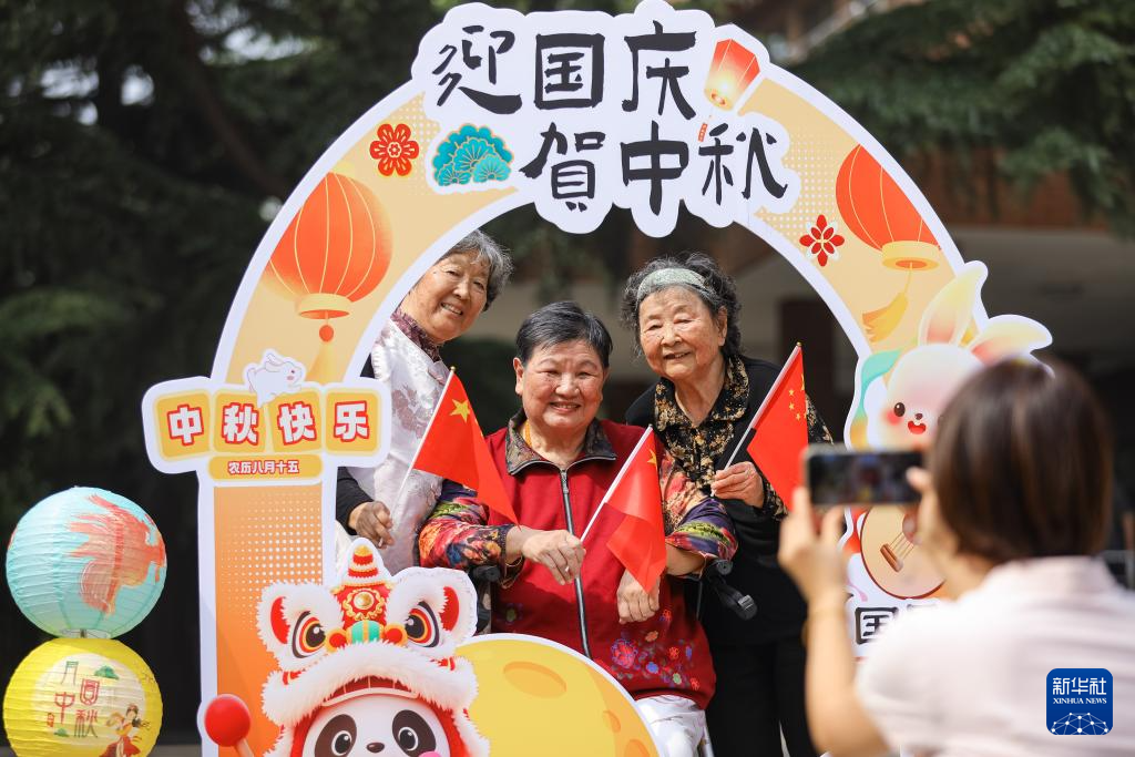 9月29日,在山东省青岛市李沧区颐福养老院,工作人员在“喜迎国庆 月满中秋”主题活动上为老人们拍照。