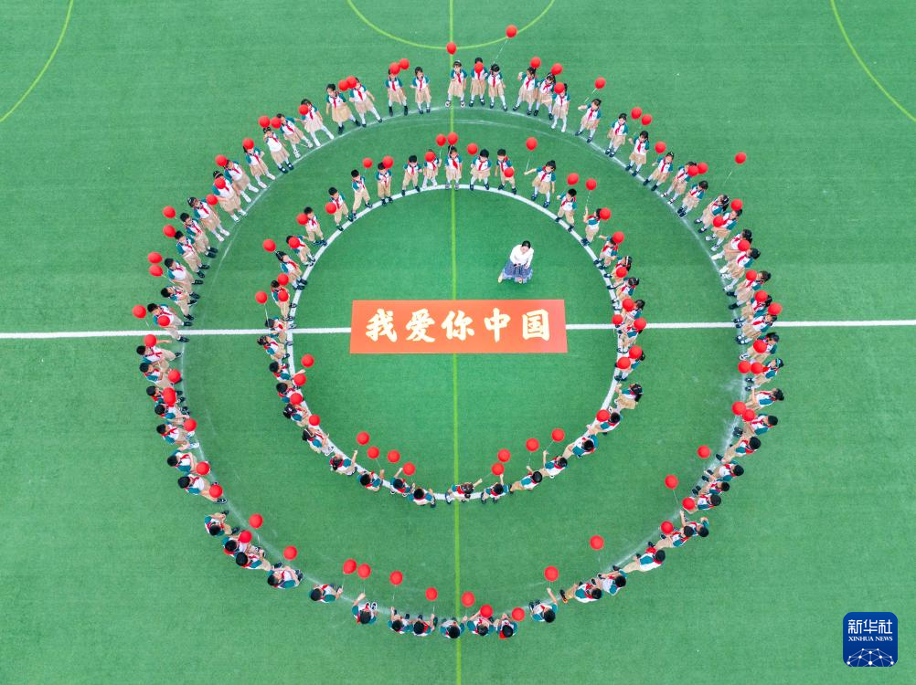 9月28日,江苏省泰州市姜堰区东桥小学教育集团东板桥校区学生学唱爱国歌曲,迎接国庆节(无人机照片)。