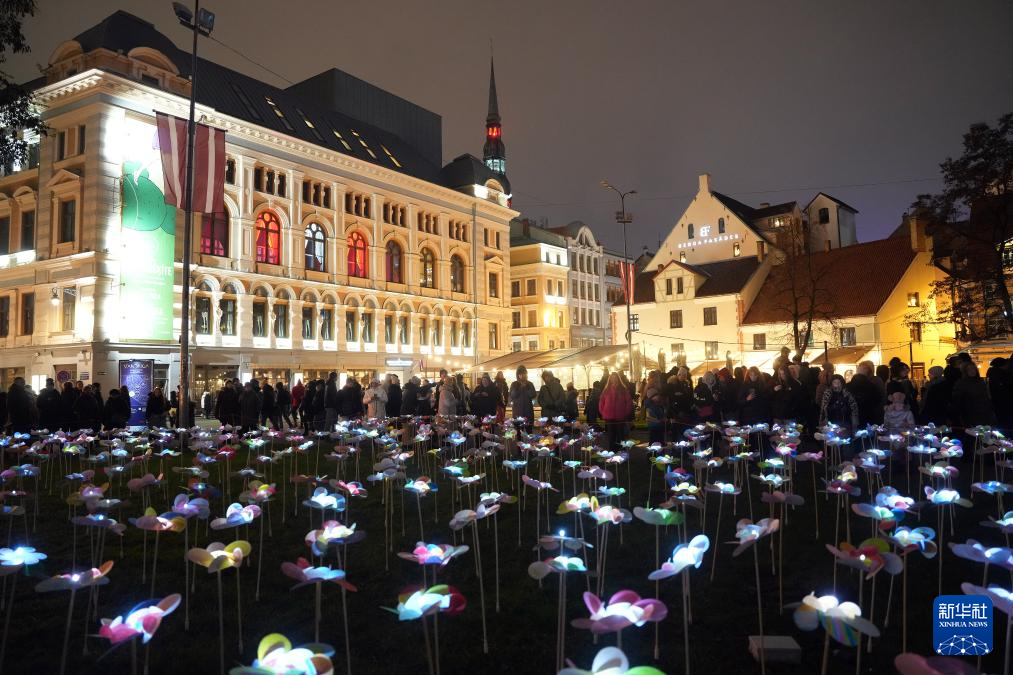 11月17日,民众在拉脱维亚首都里加举行的灯光节上欣赏被照亮的国家歌剧舞剧院。