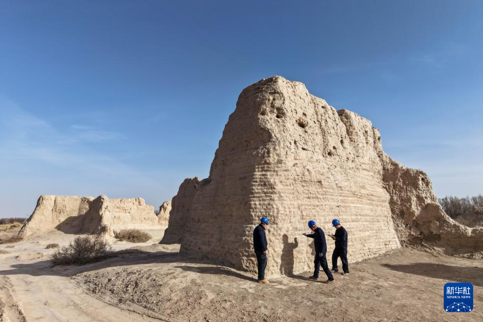 11月18日,敦煌研究院文物保护技术服务中心工作人员观察西墙马面的夯筑支顶加固效果(无人机照片)。