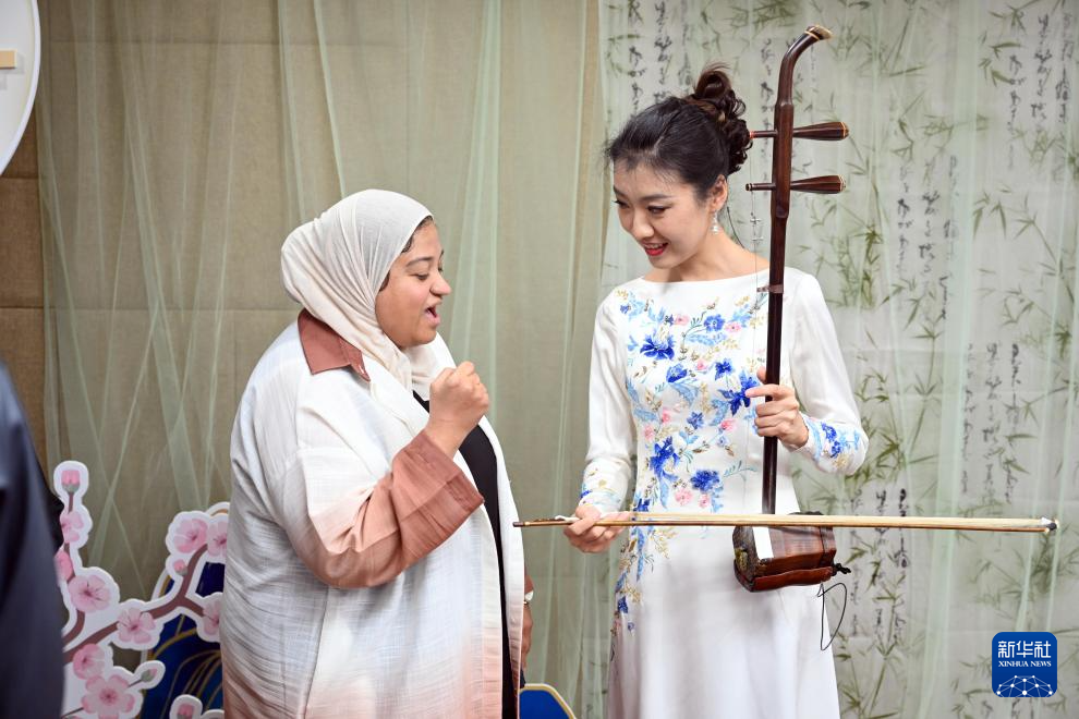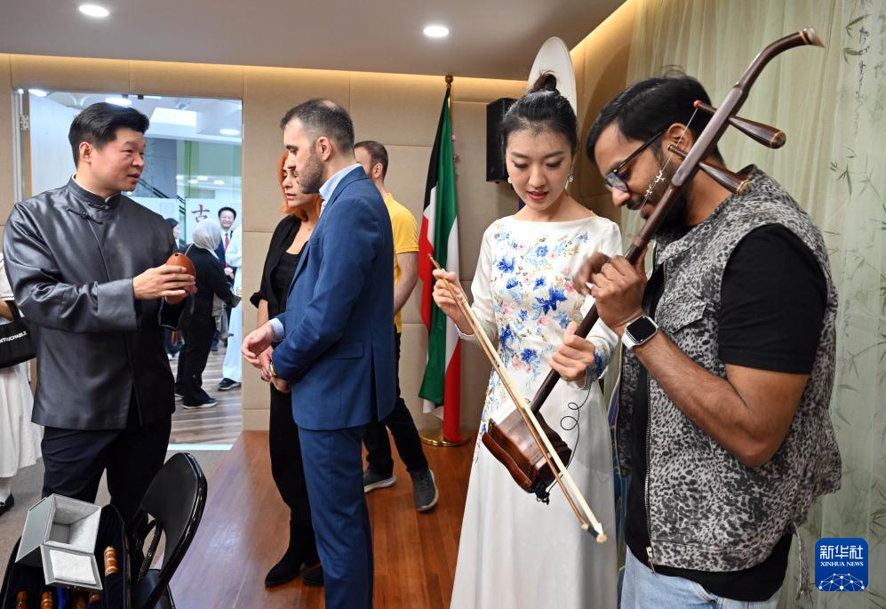 11月24日,在科威特哈瓦利省的科威特中国文化中心,中国音乐家与当地观众进行互动。