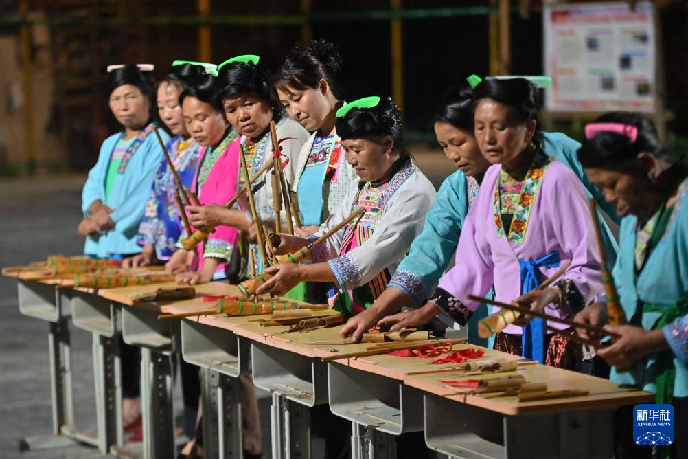 在融水县杆洞乡党鸠村夜校课堂上,妇女们参加芦笙组装比赛(2024年7月11日摄)。