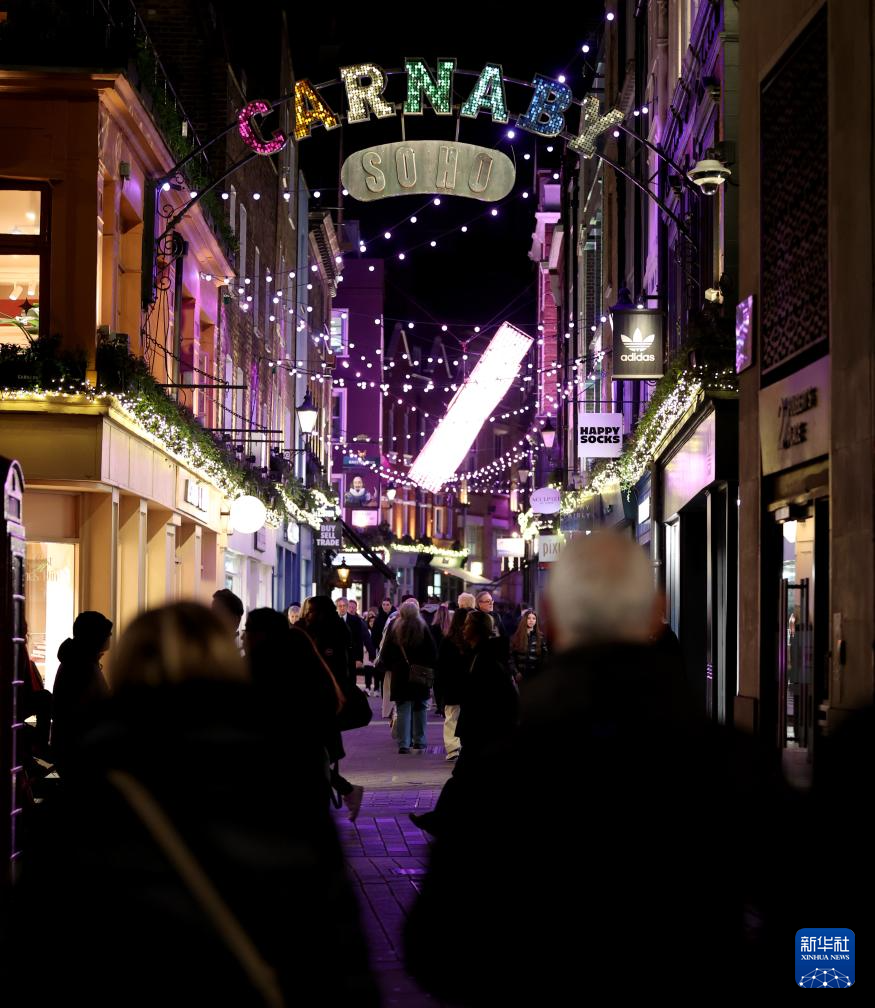 12月17日,在英国伦敦,人们走在悬挂彩灯的步行街上。新华社记者 李颖 摄