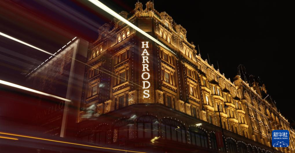 这是12月17日在英国伦敦拍摄的哈罗德百货商店外的彩灯。新华社记者 李颖 摄