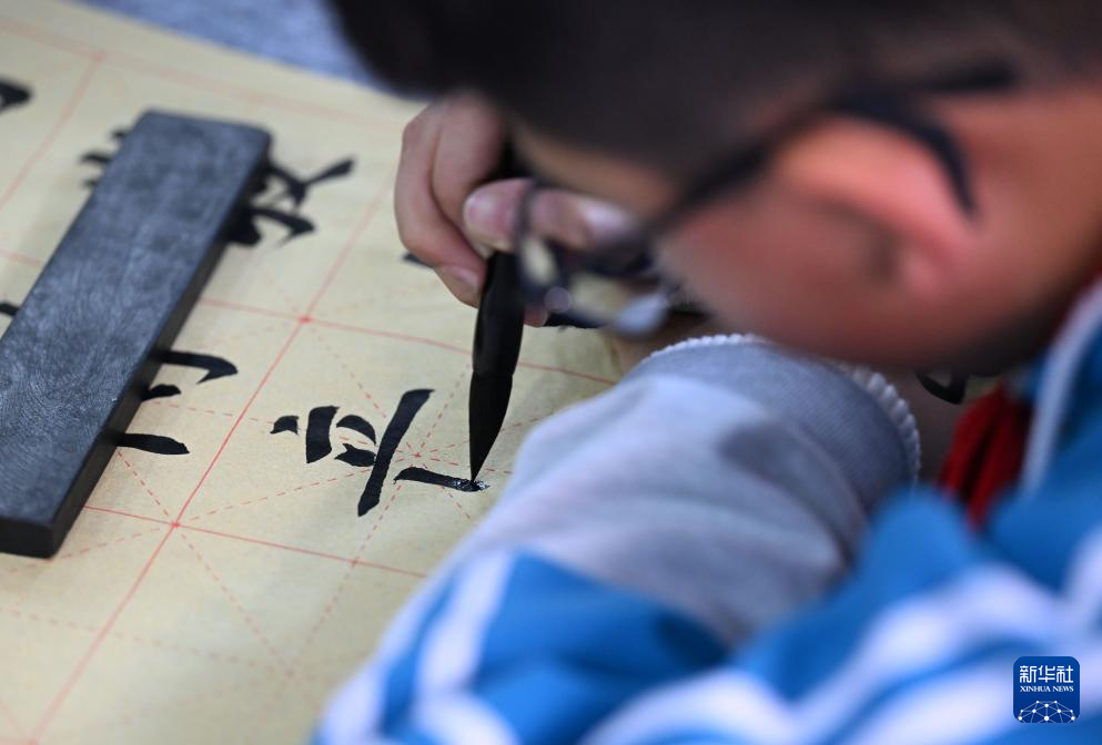 1月6日,在天津市武清区杨村第十四小学林中阳书法工作室,学生在练习书法。