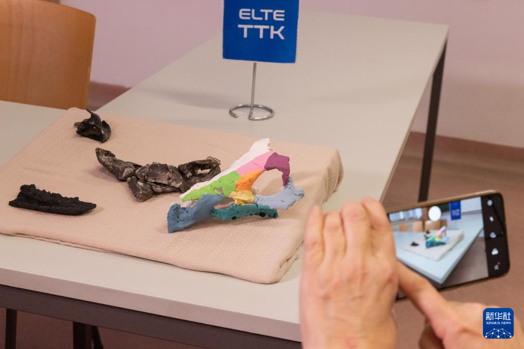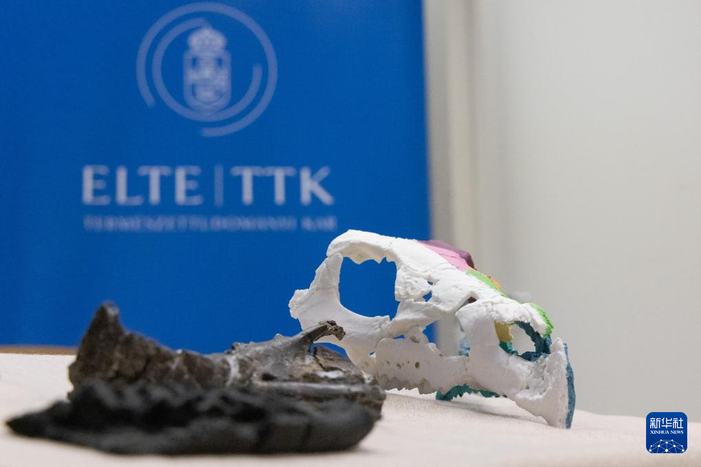 这是1月7日在匈牙利布达佩斯洛兰大学举行的新闻发布会上拍摄的科兹玛奥伊考角龙头骨化石及其3D复制模型。