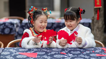 2月4日,在内蒙古呼和浩特市和林格尔土城子国家考古遗址公园剪纸陈列馆,两名儿童在观看剪纸创作。