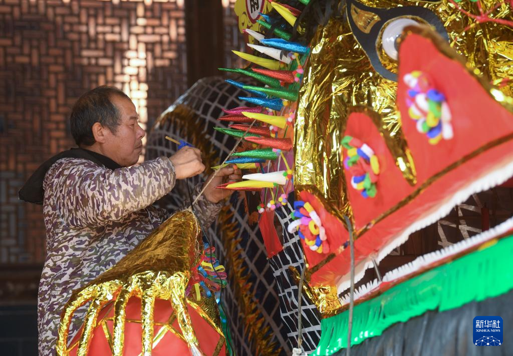 2月4日,在安华镇丰江周村的宗祠,村民在给龙头做装饰。