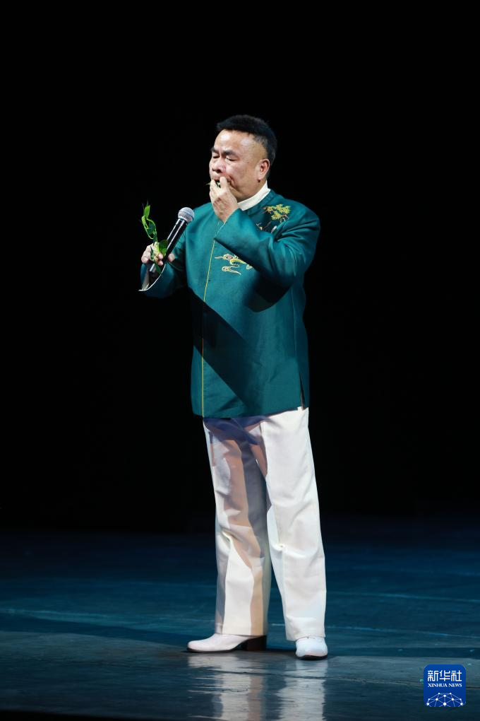2月4日,在吉尔吉斯斯坦首都比什凯克举行的“欢乐春节”文艺演出上,演员表演树叶吹奏《家乡有座风雨桥》。