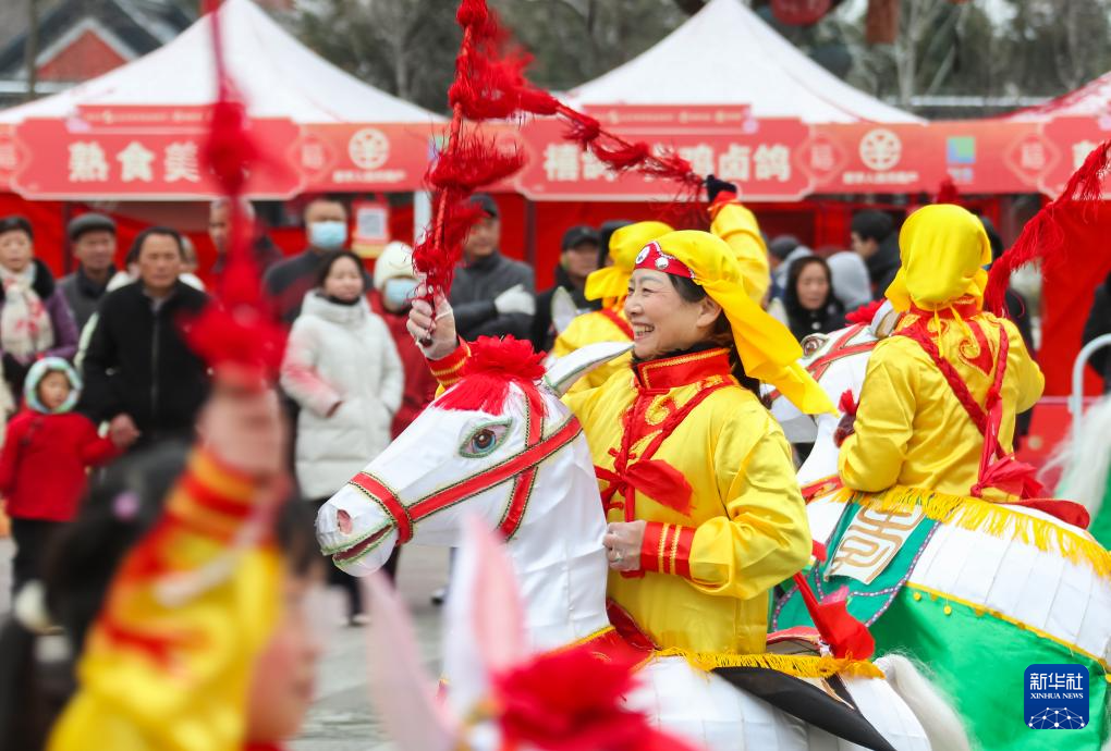 2月7日,民间艺人在江苏省句容市举办的年货大集活动中表演“马灯阵舞”。