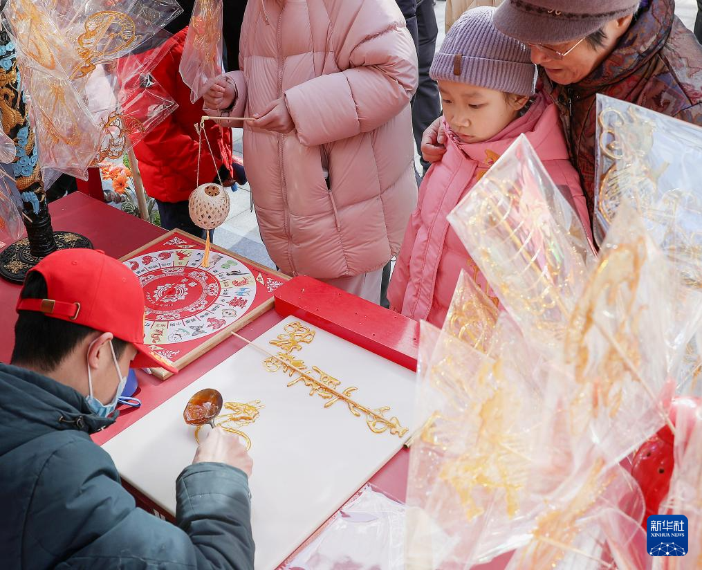 2月10日,在北京隆福寺街区的新春市集上,小朋友等待糖画制作。