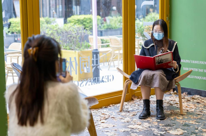 11月19日,人们在上海市徐汇区西岸艺术中心附近一家书店内阅读拍照。