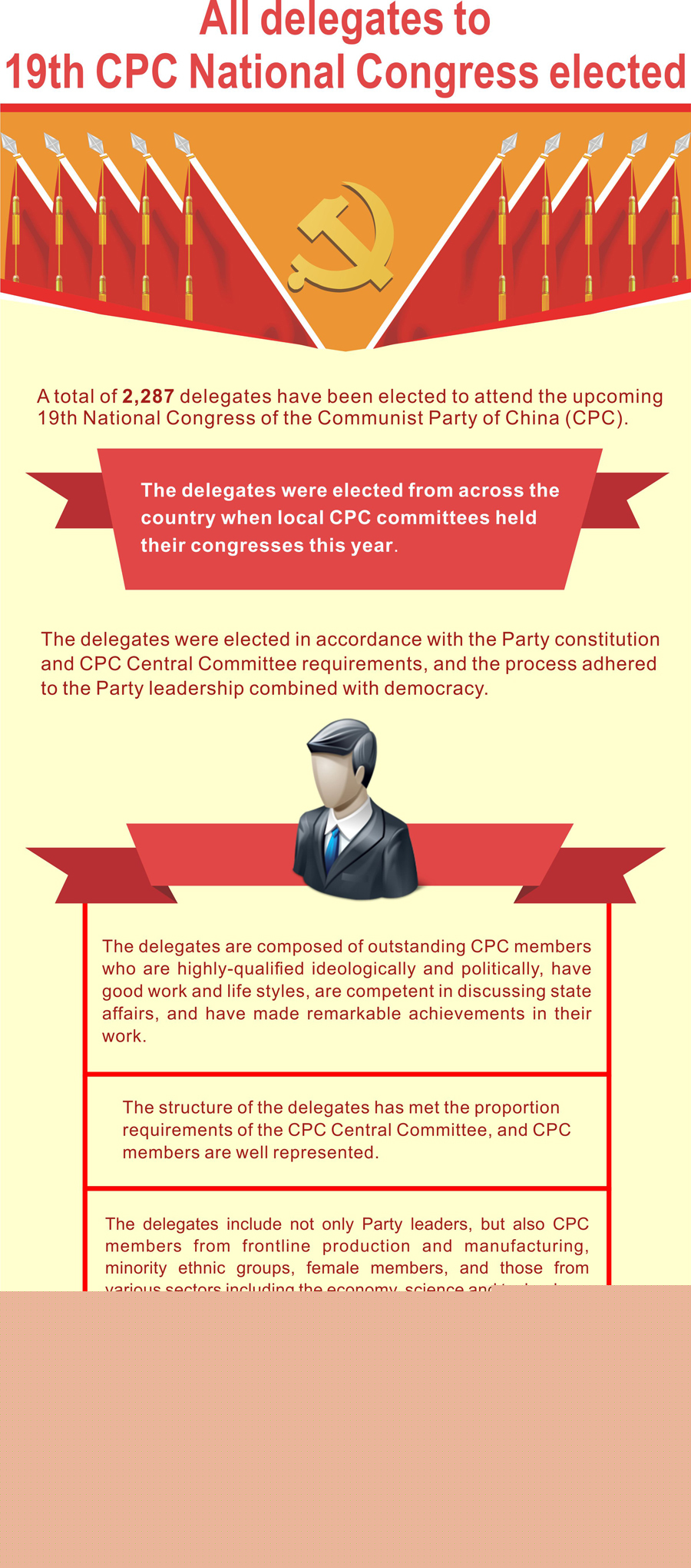 In about one year, 2,287 delegates have been elected to attend the upcoming 19th National Congress of the Communist Party of China (CPC), to be held in Beijing from Oct. 18. According to requirements, nominees must be highly qualified politically and ideologically, have good work and life styles, be competent in discussing state affairs, and have been successful in their work. Among them, 771 delegates are from frontline production and manufacturing, including workers, farmers, and technicians, accounting for 33.7 percent of the total, up by 3.2 percentage points from five years ago. These delegates not only come from traditional industries like manufacturing, transportation, steel and coal, but also from sectors such as finance, the Internet, and social organizations. (Xinhua/Wang Yongzhuo)