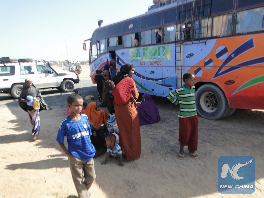 Somali refugees prepare to get on a bus heading for Somalia at Dadaab in Garissa, Kenya, July 1, 2016. The Kenyan government on Friday kicked off voluntary repatriation of Somali refugees at the Dadaab, the world's largest refugee camp in northeast part of the country. (Xinhua/Stephen Ingati)