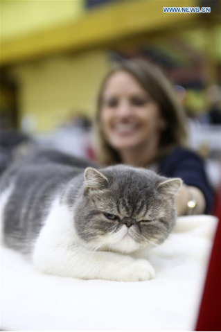 A cat is presented to Sofisticat Spring International Cat Show in Bucharest, capital of Romania, on April 2, 2017.(Xinhua/Gabriel Petrescu)