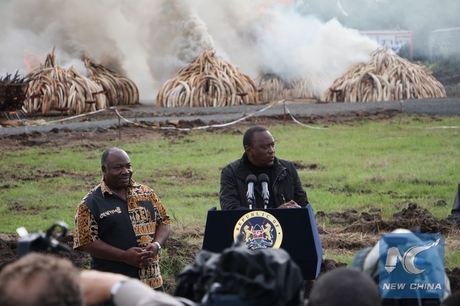 Photo shows the historic torching of ivory and rhino horns at Nairobi National Park in Nairobi, Kenya, April 30, 2016. A total of 105 tons of elephant tusks and 1.3 tons of rhino horns were burned in a ceremony attended by conservation luminaries, business moguls and celebrities from around the globe. (Xinhua/Allan Mutiso)