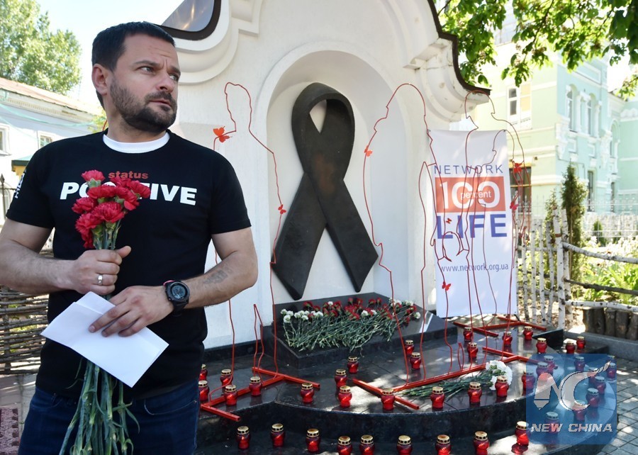 An HIV-infected man wearing T-shirt with signing "Status positive" stands as he holds flowers at the Red Ribbon Memorial in Kiev on May 15, 2017, during the ceremony marking the International Memorial Day of People Who Died from AIDS. (Xinhua/AFP)