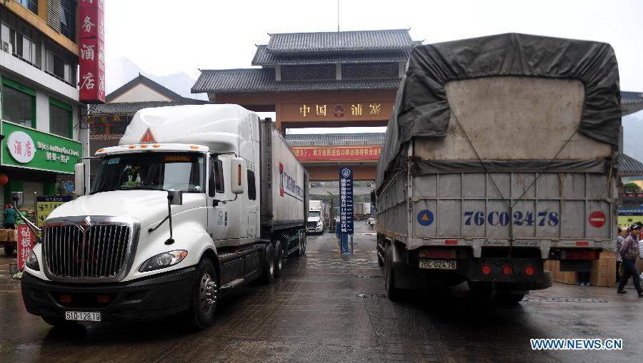 Trucks from ASEAN countries enter Puzhai port of entry in Pingxiang City of south China's Guangxi Zhuang Autonomous Region, Jan. 16, 2018. By making full use of its geographical location and the potential ofcoastlines and border areas, Guangxi capitalized on its advantages and played a bigger role in the Belt and Road Initiative. Through ports and the Beibu Gulf Economic Zone, the trade cooperation between Guangxi and ASEAN countries gained great prospects.(Xinhua/Zhang Ailin)