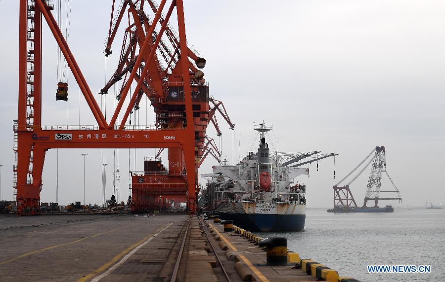 Photo taken on Jan.10, 2018 shows Qinzhou port in south China's Guangxi Zhuang Autonomous Region. By making full use of its geographical location and the potential of coastlines and border areas, Guangxi capitalized on its advantages and played a bigger role in the Belt and Road Initiative. Through ports and the Beibu Gulf Economic Zone, the trade cooperation between Guangxi and ASEAN countries gained great prospects. (Xinhua/Lu Boan)