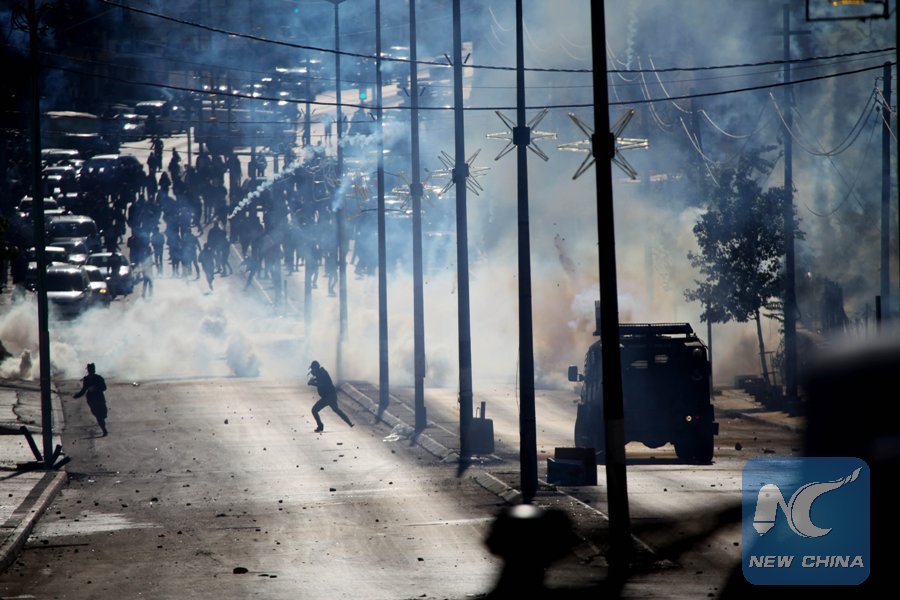 Palestinian protesters run to take cover from tear gas fired by Israeli troops during clashes after a protest against U.S. President Donald Trump's decision to recognize Jerusalem as the capital of Israel, in the West Bank city of Bethlehem on Dec. 8, 2017.(Xinhua/Mamoun Wazwaz)