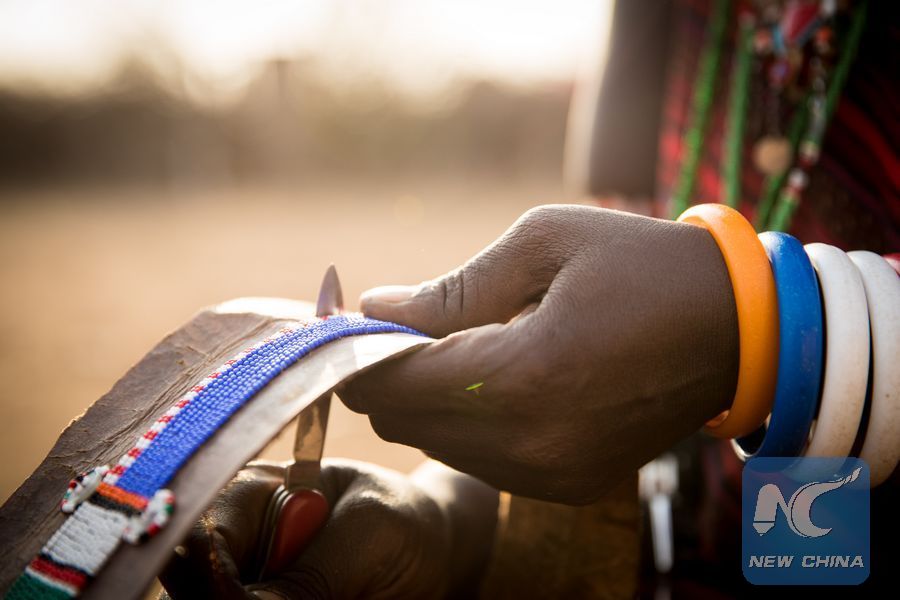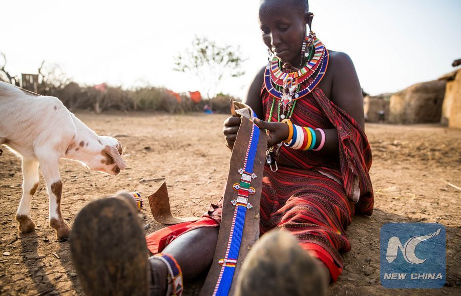 A Masai woman makes traditional belt at a Masai village in Amboseli National Park, Kenya, Jan. 9, 2018. (Xinhua/Lyu Shuai)