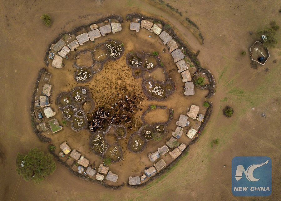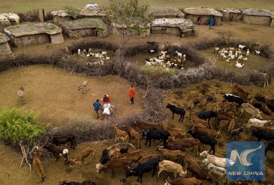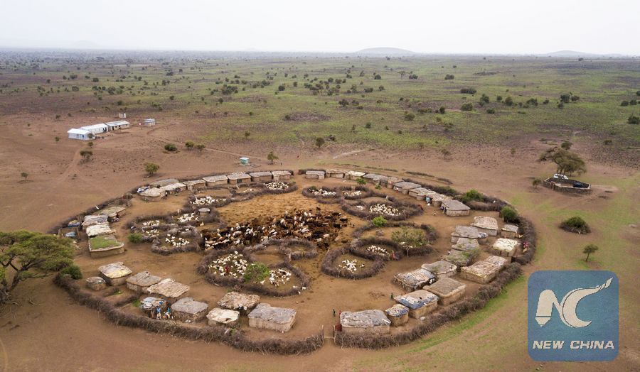 Photo taken on Jan. 11, 2018 shows an aerial view of a Masai village in Amboseli National Park, Kenya. (Xinhua/Lyu Shuai)