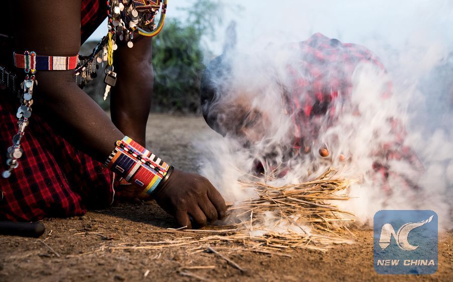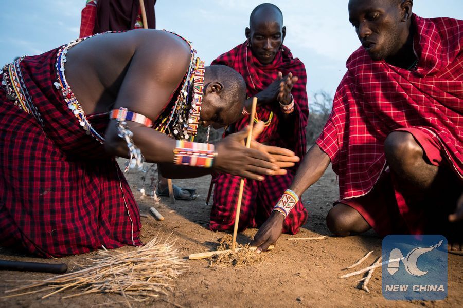 Masais make fire by rubbing sticks at a Masai village in Amboseli National Park, Kenya, Jan. 9, 2018. (Xinhua/Lyu Shuai)