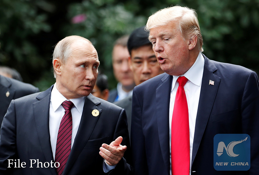 U.S. President Donald Trump and Russia's President Vladimir Putin talk during the family photo session at the APEC Summit in Danang, Vietnam November 11, 2017. (REUTERS PHOTO)
