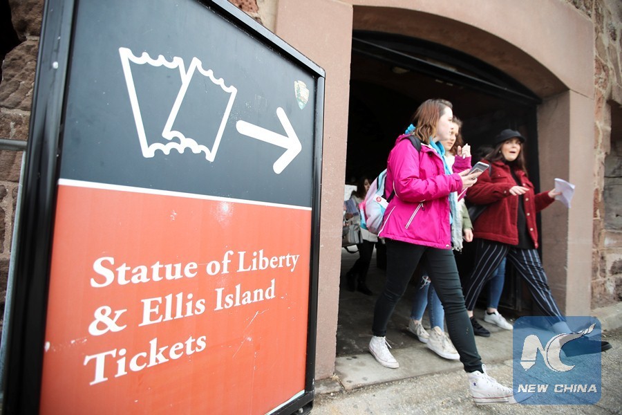 Tourists visit the Statue of Liberty on Liberty Island in New York, the United States, Jan. 22, 2018. New York City's iconic landmark the Statue of Liberty reopened Monday at the expense of state funds following a brief closure as a result of the U.S. federal government shutdown. (Xinhua/Wang Ying)