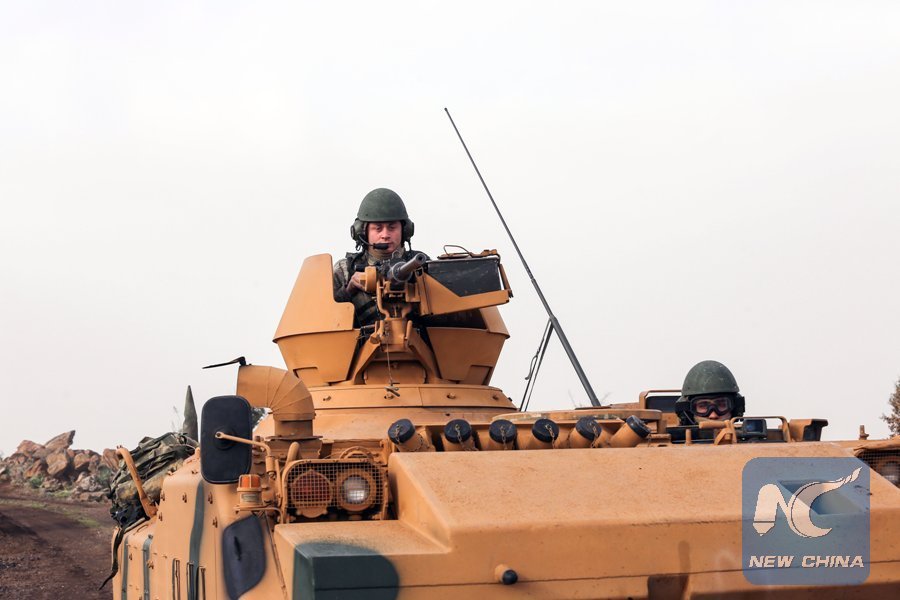 Soldiers are seen in a Turkish armored vehicle in Afrin, Syria, on Jan. 22, 2018. (Xinhua)