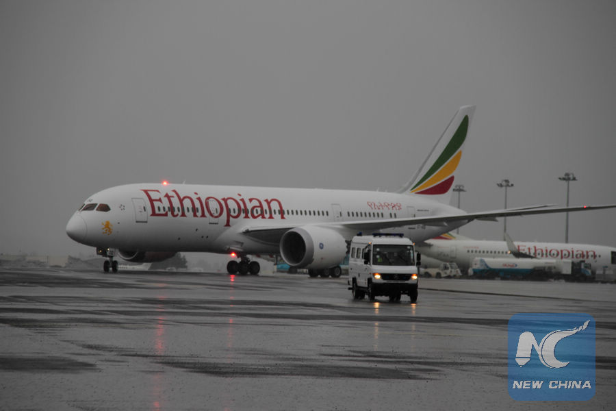 Photo taken on Oct. 12, 2017 shows an Ethiopian Airlines plane at the Bole International Airport in Addis Ababa, capital of Ethiopia. (Xinhua/Michael Tewelde)