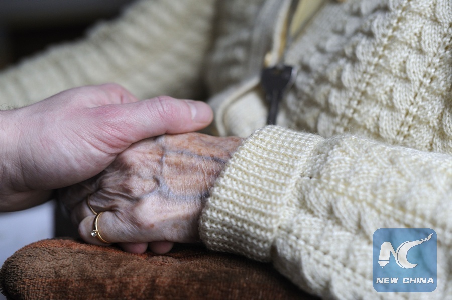This file photo taken on March 18, 2011 shows a woman, suffering from Alzheimer's desease, holding the hand of a relative in a retirement house in Angervilliers, eastern France. (Xinhua/AFP PHOTO)