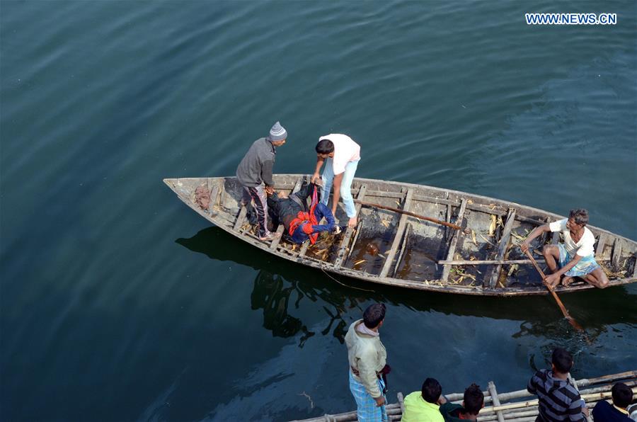 Rescuers search for survivors on a boat in Murshidabad district, in eastern India's West Bengal state, on Jan. 29, 2018. At least 35 people have been killed after a passenger bus crashed through an old bridge and plunged into a deep canal connected to a river in the eastern Indian state of West Bengal Monday, police said. (Xinhua)