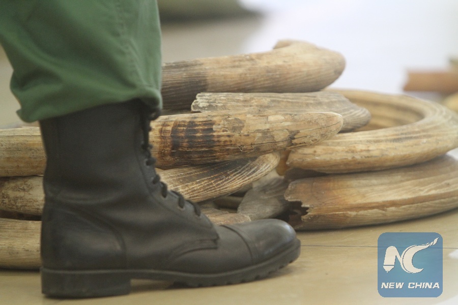 Part of the hippo teeth consignment are displayed during an auction held in Dar es Salaam, Tanzania, on Jan. 29, 2018. (Xinhua)