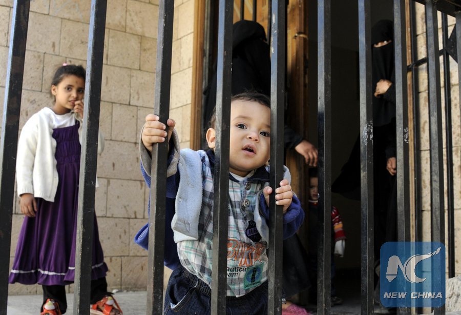 A Yemeni child stands at a temporary evacuation center in Sanaa, capital of Yemen, Dec. 19, 2015, as his family was forced to flee from home due to the ongoing air strikes and internal conflicts. (Xinhua/Hani Ali)