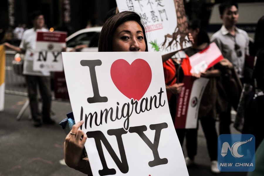 Protesters hold up signs during a demonstration against U.S. President Donald Trump during a rally in support of the Deferred Action for Childhood Arrivals (DACA), also known as Dream Act, near the Trump Tower in New York on Oct. 5, 2017. (Xinhua/AFP)
