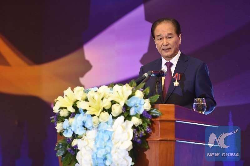 Xinhua President Cai Mingzhao speaks at the medal award ceremony in Vientiane, Laos on Feb. 2, 2018. (Xinhua/Qin Qing)