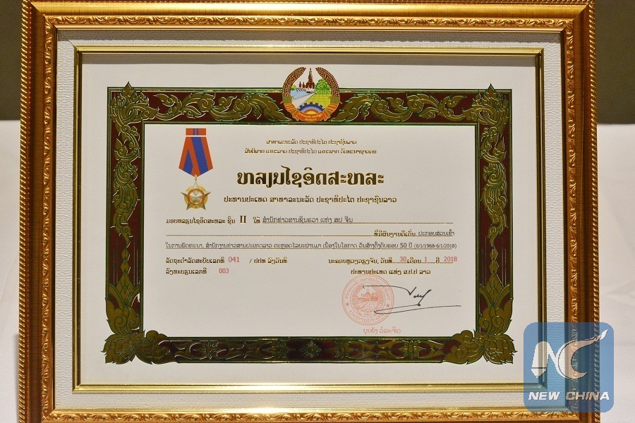 China's Xinhua News Agency awarded freedom medal in Vientiane, Laos on Feb. 2, 2018.(Xinhua/Qin Qing)