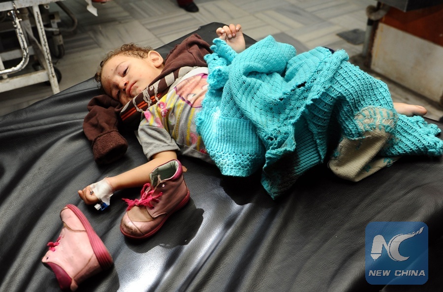A wounded child is seen in a hospital in Damascus, capital of Syria, on Feb.20, 2018. Tens of people have been taken to the hospitals Tuesday due to the intensified rebels' mortar attack that targeted several parts of Damascus as part of an ongoing military showdown between the rebels and the government forces. (Xinhua/Ammar Safarjalani)