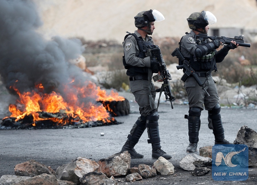 Israeli border policemen stand on a road during a protest against U.S. President Donald Trump's decision to recognize Jerusalem as the capital of Israel, near the Jewish settlement of Beit El, near the West Bank city of Ramallah Dec. 15, 2017. (Xinhua/REUTERS)