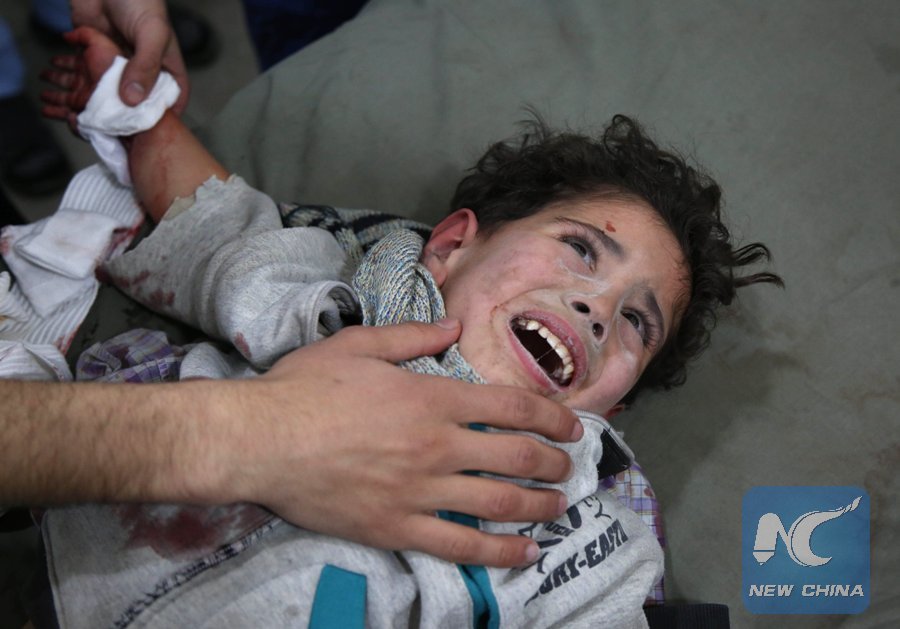 A wounded Syrian child lies at a makeshift clinic following Syrian government bombardments in Kafr Batna, in the besieged Eastern Ghouta region on the outskirts of the capital Damascus on Feb. 22, 2018. (Xinhua/AFP)