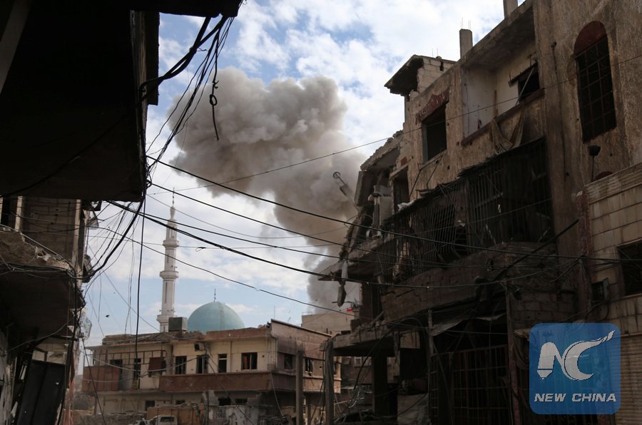 Smoke and dust are seen following a reported regime air strike in the rebel-held town of Hamouria, in the besieged Eastern Ghouta region on the outskirts of the capital Damascus on Feb. 21, 2018. (Xinhua/AFP)
