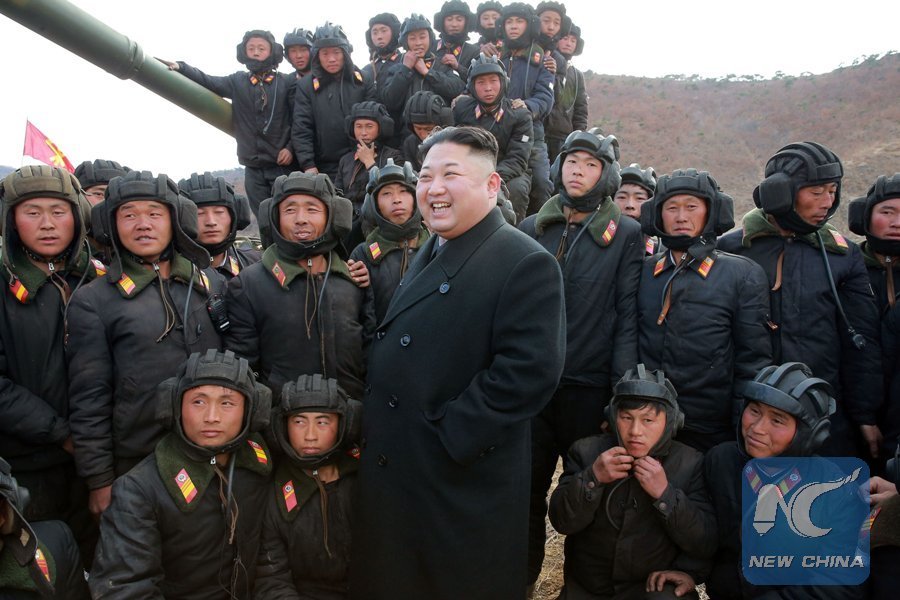 Photo provided by Korean Central News Agency (KCNA) on April 1, 2017 shows top leader of the Democratic People's Republic of Korea (DPRK) Kim Jong Un (Front) guiding the Korean People's Army Tank Crews' Competition-2017. (Xinhua/KCNA)