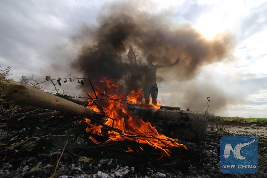 A Palestinian protester burns a tire during clashes with Israeli troops after a protest against U.S. President Donald Trump's decision to recognize Jerusalem as the capital of Israel, in the southern Gaza Strip city of Khan Younis on Dec. 7, 2017. (Xinhua/Khaled Omar)