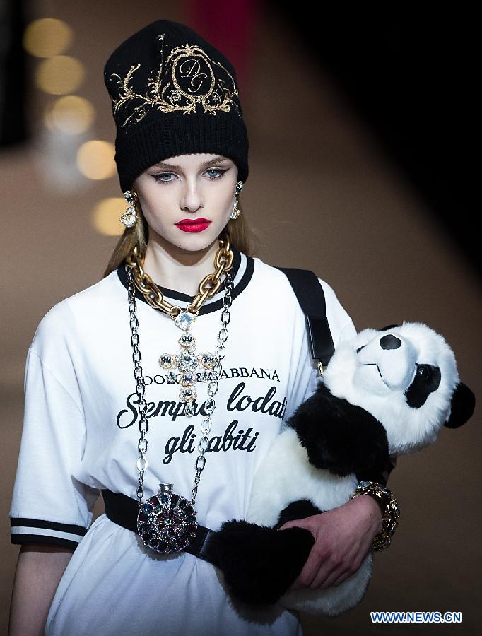 A model presents a creation of Dolce&Gabbana "Fashion Devotion" Autumn/Winter 18/19 women's collection during Milan Fashion Week in Milan, Italy, Feb. 25, 2018. (Xinhua/Jin Yu)