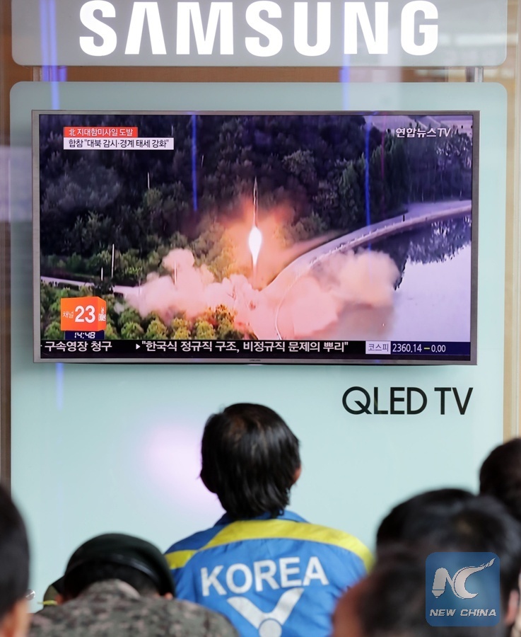 People watch news at train station in Seoul, South Korea, June 8, 2017. The Democratic People's Republic of Korea (DPRK) test-fired multiple projectiles believed to be ground-to-ship cruise missiles into its eastern waters, South Korea's Joint Chiefs of Staff (JCS) said. (Xinhua/Lee Sang-ho)
