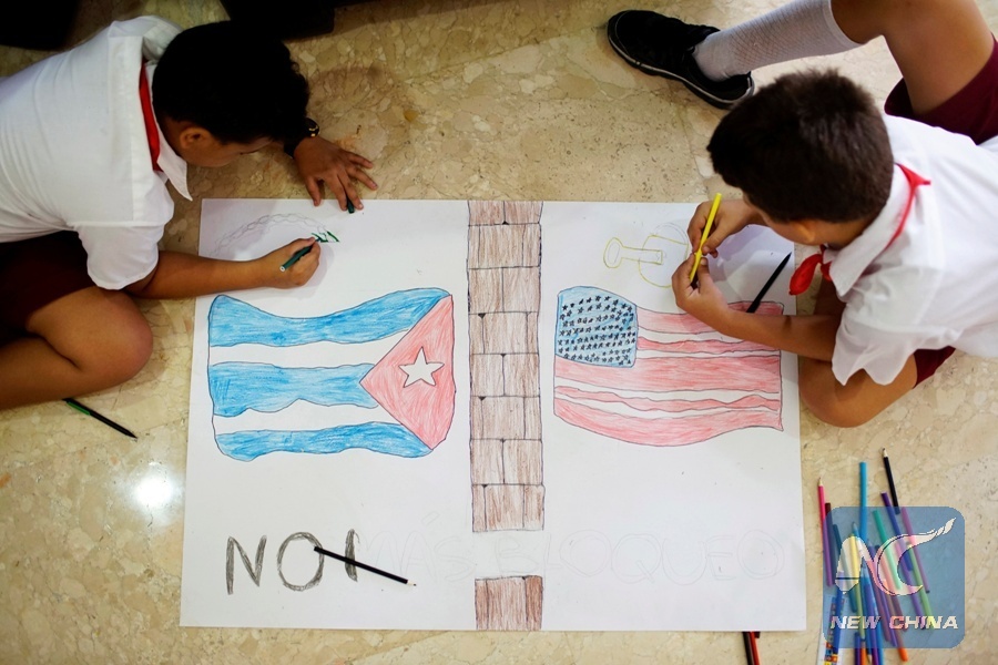 Children draw flags from Cuba and the U.S. during the XIV Civil Society Forum against the 50-year-long standing U.S. economic and trade embargo against Cuba in Havana, Cuba, Oct. 18, 2017. (Xinhua/REUTERS)