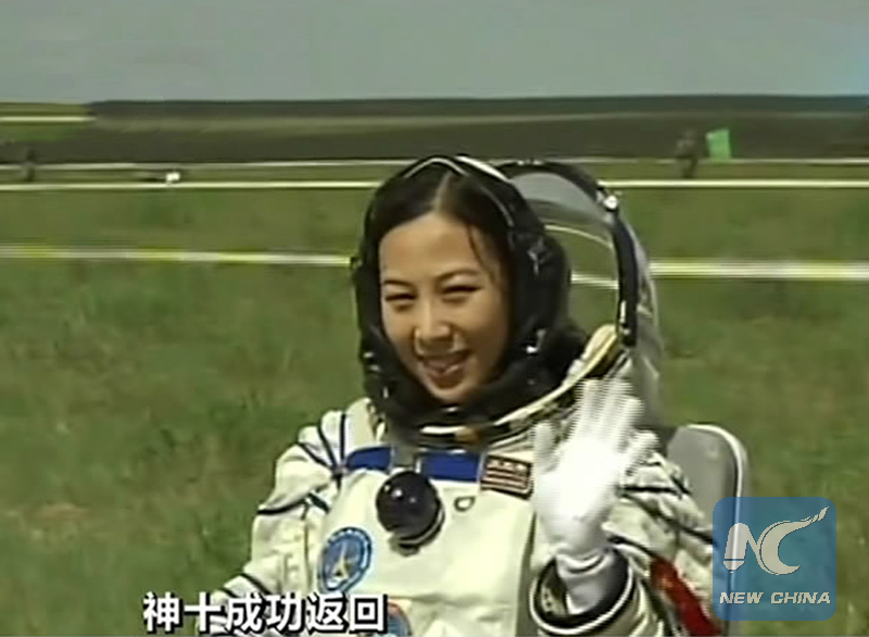 The screenshot shows Wang Yaping waving to people after going out of the re-entry capsule of China's Shenzhou-10 spacecraft following its successful landing at the main landing site in north China's Inner Mongolia Autonomous Region on June 26, 2013. (Xinhua file photo)