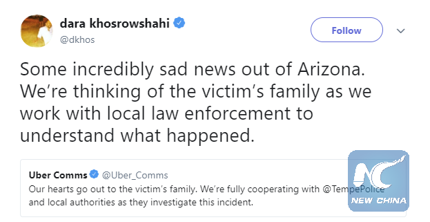 Social media users expressed sadness and regret for the death of 49-year-old Elaine Herzberg, who was pushing her bicycle across the street in Tempe City in the southwestern U.S. state of Arizona when she was hit by the Uber self-driving vehicle on Sunday.